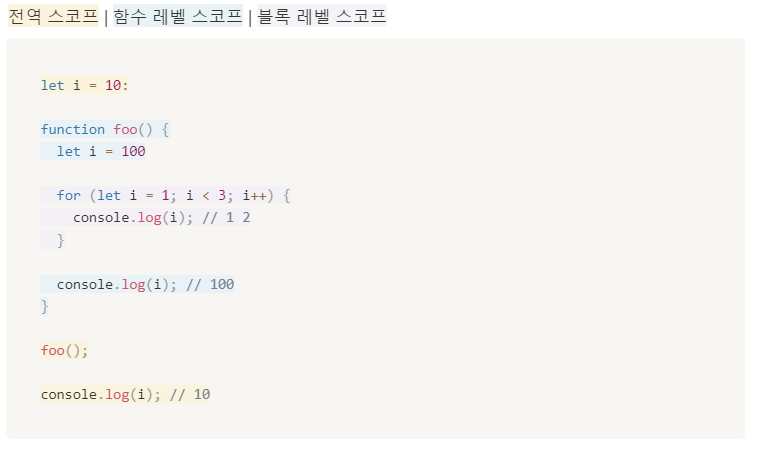 let foo = 1; // μ μ λ³μ { let foo = 2; // μ§μ λ³μ let bar = 3; // μ§μ λ³μ } console.log(foo); // 1 console.log(bar); // ReferenceError: bar is not defined